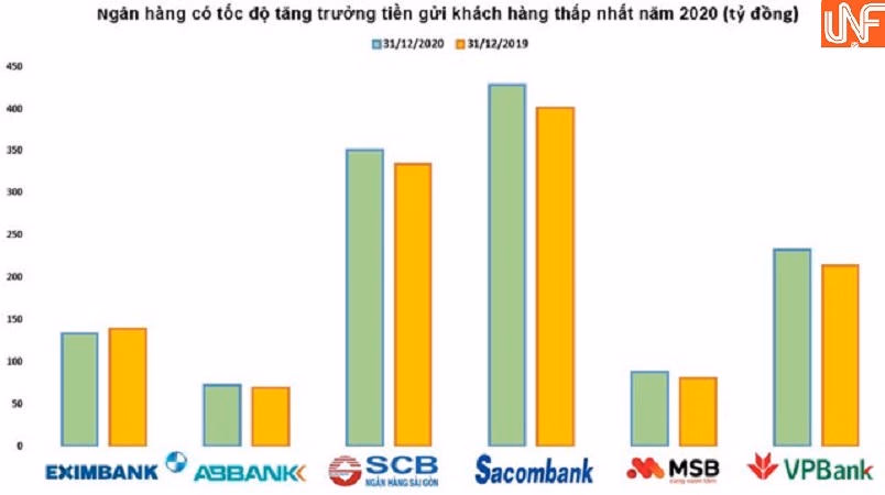 Tuy nhiên, vẫn có ngân hàng lớn ghi nhận mức tăng trưởng dưới 10% trong năm 2020 như tiền gửi khách hàng tại Sacombank chỉ tăng 7%; tại SCB chỉ tăng 5%.
