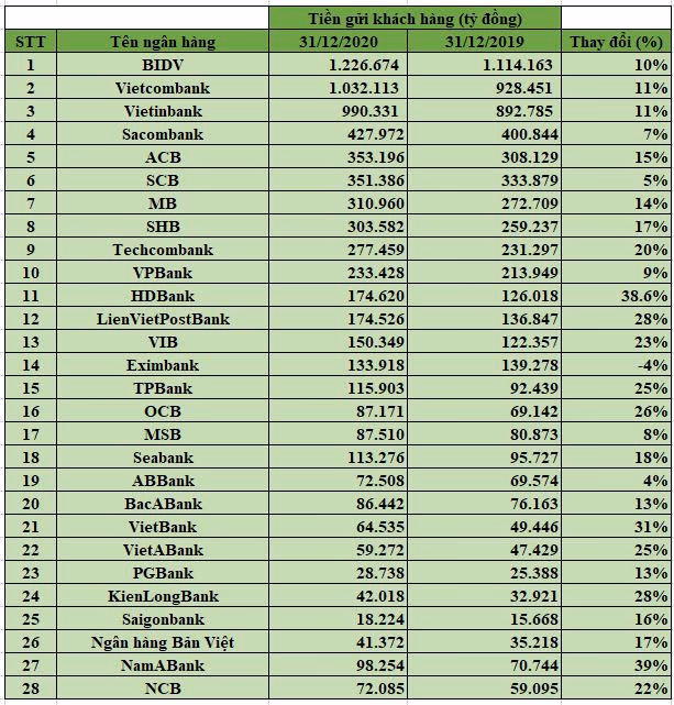Kết thúc năm tài chính 2020, 10 ngân hàng có lượng tiền gửi khách hàng lớn nhất gồm có BIDV, Vietcombank, VietinBank, Sacombank, ACB, SCB, MB, SHB, Techcombank, VPBank.