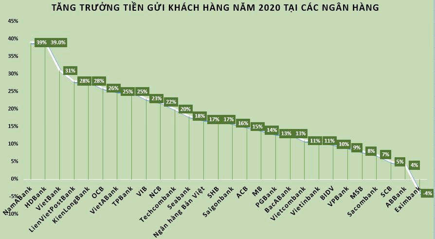 Xét về tăng trưởng tương đối, trong 28 ngân hàng chỉ có duy nhất Eximbank là có số dư tiền gửi khách hàng giảm 4% so với năm 2019, còn lại đều ghi nhận tăng trưởng từ 4% (tại ABBank) tới 39% (tại Nam A Bank và HDBank).
