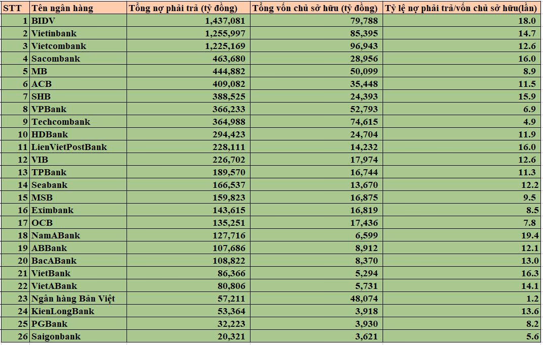 Những cái tên quen thuộc tiếp theo gồm Sacombank, LienVietPostBank, VietBank, đều có số dư nợ phải trả gấp khoảng 16 lần vốn chủ sở hữu. Thấp hơn có thể kể đến, như nợ phải trả tại KienLongBank gấp 13,6 lần vốn chủ sở hữu, tại Vietcombank, tỷ lệ nợ phải trả gấp 12,6 lần vốn chủ sở hữu.