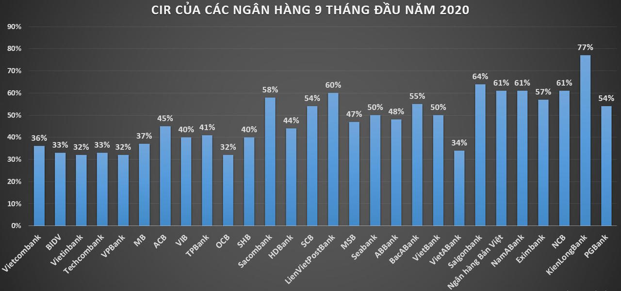 Thống kê từ 28 ngân hàng cho thấy CIR có sự phân hóa rõ rệt giữa các nhóm ngân hàng, dao động từ 30% cho đến gần 80%. Thống kê cho thấy, có 8/28 ngân hàng có CIR dưới 40% khi kết thúc 9 tháng đầu năm 2020