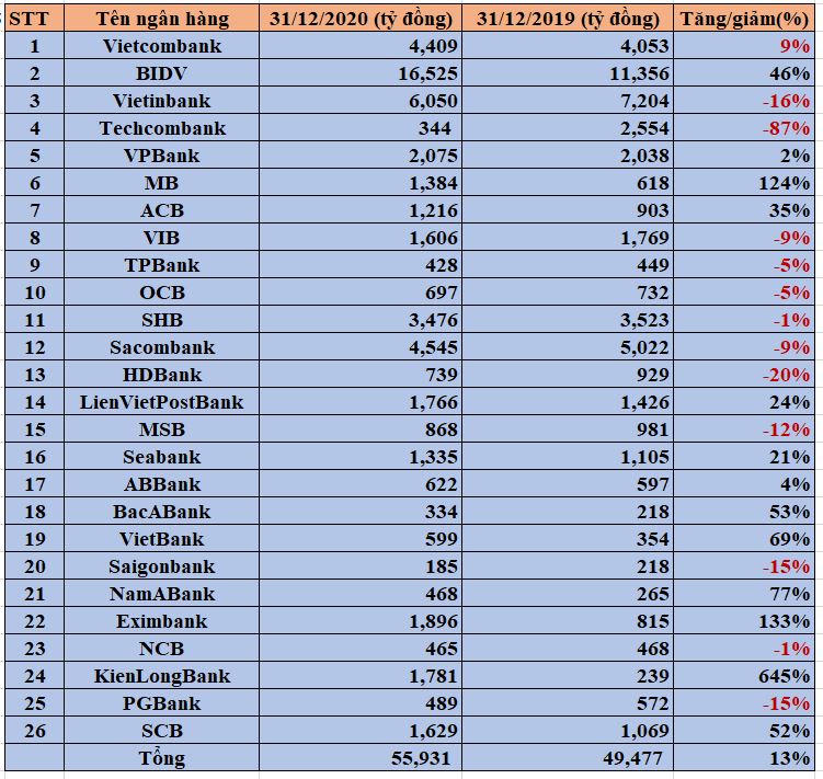 Theo thống kê từ báo cáo tài chính hợp nhất quý 4/2020 tại 26 ngân hàng, tổng dư nợ có khả năng mất vốn (nợ nhóm 5 – nhóm nợ nguy hiểm nhất) đến thời điểm 31/12/2020 ở mức hơn 55.931 tỷ đồng, tăng 13% so với cuối năm 2019.