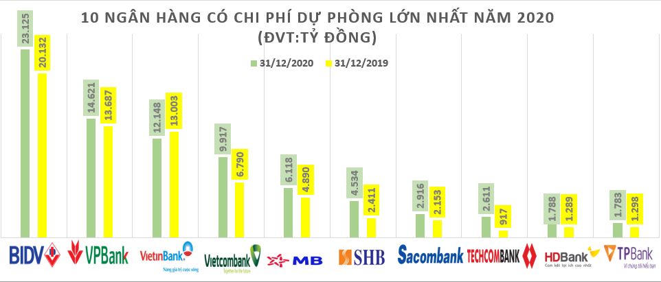 Theo thống kê từ báo cáo tài chính hợp nhất quý 4/2020 của 27 ngân hàng trong nước, top 10 ngân hàng có chi phí dự phòng rủi ro lớn nhất năm 2020 gồm BIDV (23.125 tỷ đồng), VPBank (14.621 tỷ đồng), Vietinbank (12.148 tỷ đồng), Vietcombank (9.917 tỷ đồng), MB (6.118 tỷ đồng), SHB (4.534 tỷ đồng), Sacombank (2.916 tỷ đồng), Techcombank (2.611 tỷ đồng), HDBank (1.788 tỷ đồng), TPBank (1.783 tỷ đồng). Tổng chi phí dự phòng của 10 ngân hàng này đạt 79.561 tỷ đồng.