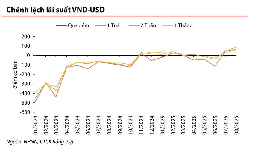 Ngoài ra, chênh lệch lãi suất VND – USD cũng như biến động chỉ số sức mạnh USD (DXY) không phải là yếu tố gây áp lực lên tỷ giá trong giai đoạn hiện nay. “Lãi suất cho vay VND qua đêm trung bình trong tháng 8 đạt khoảng 5%, dẫn đến mức chênh lệch dương giữa VND – USD trong tháng qua. Điều này cho thấy chênh lệch lãi suất VND – USD không phải là yếu tố gây áp lực đối với tỷ giá”, chuyên gia VDSC dẫn chứng.