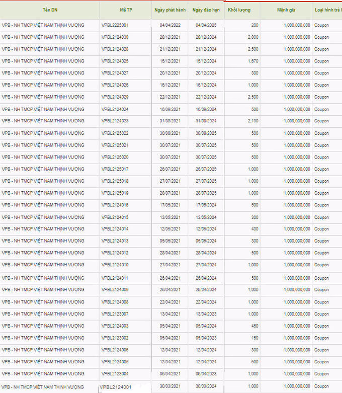 Khoảng từ tháng 4/2021 đến nay, Ngân hàng Việt Nam Thịnh Vượng (VPBank-mã chứng khoán VPB) đã 31 lần phát hành trái phiếu.
