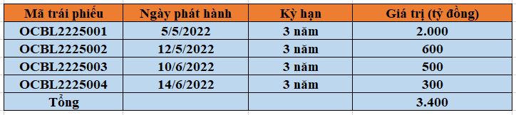 Ngày 12/5, ngân hàng OCB công bố phát hành thành công lô trái phiếu có tổng giá trị 600 tỷ đồng kỳ hạn 3 năm. Trước đó, ngày 5/5, nhà băng này cũng đã phát hành thành công lô trái phiếu có giá trị 2.000 tỷ đồng cũng có kỳ hạn 3 năm.