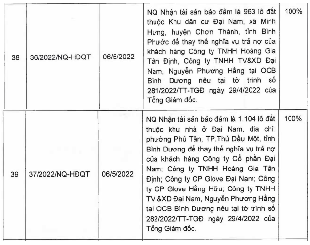 Cụ thể, Nghị quyết số 36/2022/NQ-HĐQT nhận tài sản đảm bảo là 963 lô đất thuộc Khu dân cư Đại Nam, xã Minh Hưng, huyện Chơn Thành, tỉnh Bình Phước để thay thế nghĩa vụ trả nợ của khách hàng Công ty TNHH Hoàng Gia Tân Định, Công ty TNHH TV&XD Đại Nam, bà Nguyễn Phương Hằng tại OCB Bình Dương nêu tại tờ trình số 281/2022/TT-TGĐ ngày 29/4/2022 của Tổng Giám đốc.
