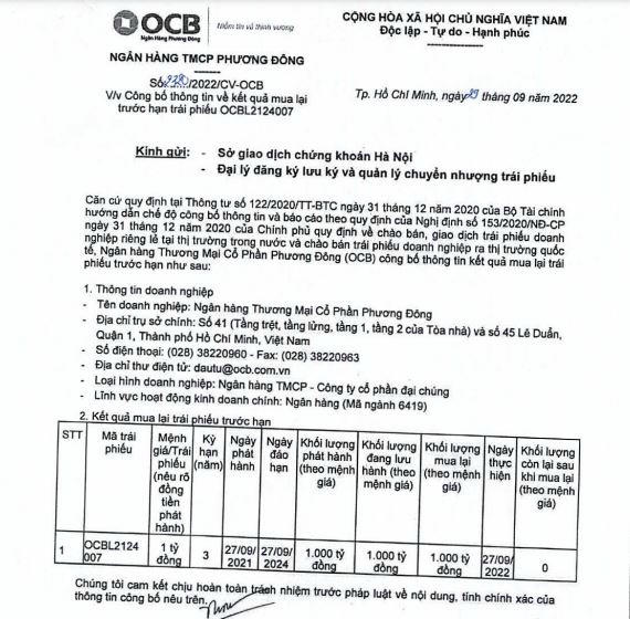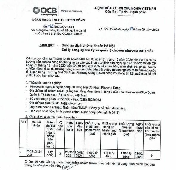 Đến ngày 28/9, nhà băng này tiếp tục mua lại toàn bộ 1.000 tỷ đồng trái phiếu trước hạn phát hành ngày 28/9/2021 mã OCBL2124008 có kỳ hạn 3 năm.