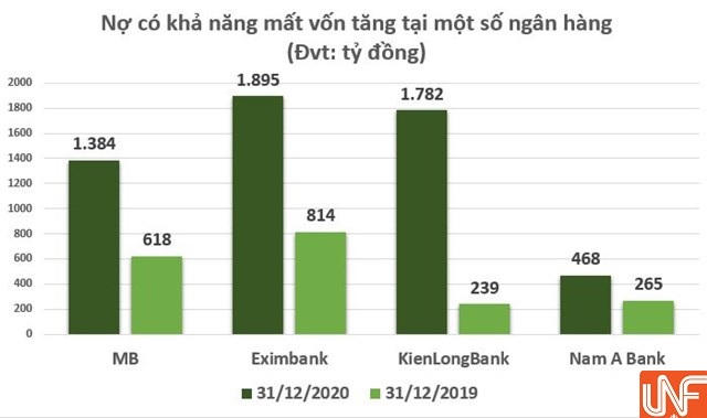 Năm 2020, nợ nhóm 5 tại BIDV, KienLongBank,... đột ngột tăng theo cấp số nhân. Điển hình tại Nam A Bank nợ xấu giảm nhưng nợ cực xấu vẫn tăng mạnh.