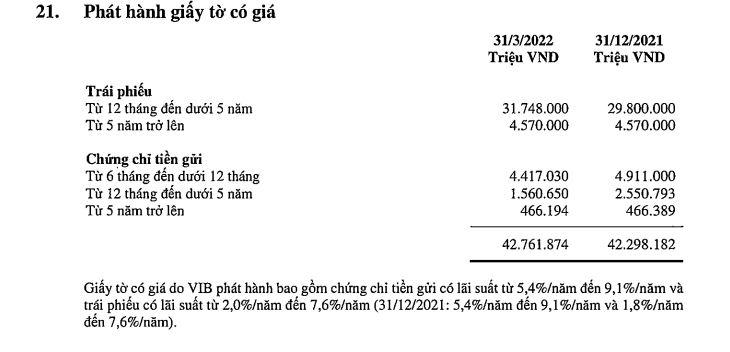Theo báo cáo tài chính hợp nhất soát xét quý 1/2022, tính đến 31/3/2022, ngân hàng VIB đã có 36.318 tỷ đồng trái phiếu đang lưu hành trên thị trường, tăng 6% so với đầu năm. Như vậy, chỉ sau 3 tháng, đã có thêm khoảng 1.900 tỷ đồng trái phiếu của VIB lưu hành. Trong đó, trái phiếu từ 12 tháng đến dưới 5 năm ghi nhận 31.748 tỷ đồng.