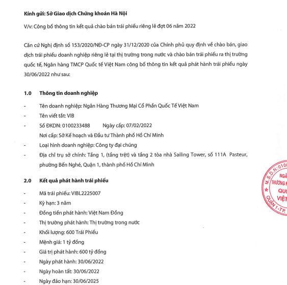 Cụ thể, lô trái phiếu này có mã là VIBL2225007, có kỳ hạn 3 năm. Khối lượng phát hành là 600 trái phiếu có giá 1 tỷ đồng/trái phiếu. Lô trái phiếu được chào bán và hoàn tất trong ngày 30/6.