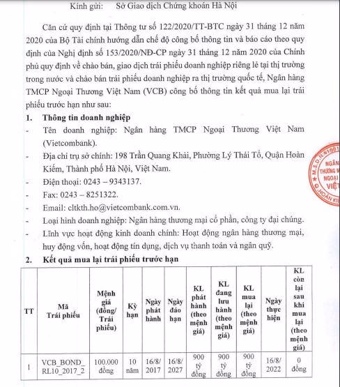 Cụ thể, ngày 31/8/2022, Vietcombank đã mua lại toàn bộ 170 tỷ đồng trái phiếu trước hạn thuộc lô trái phiếu riêng lẻ mã VCB-BOND-RL10-2017-5 tăng vốn phát hành vào ngày 31/8/2017 và ngày đáo hạn là 31/8/2027. Lô trái phiếu này có mệnh giá 100.000 đồng/trái phiếu.