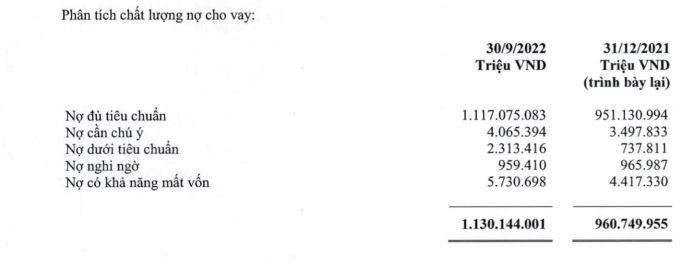 Cụ thể, tổng nợ xấu tại Vietcombank tính đến 30/09/2022 tăng đến 47% so với đầu năm, chiếm gần 9.004 tỷ đồng trong tổng dư nợ. Trong đó, nợ dưới tiêu chuẩn tăng cao gấp 3 lần so với đầu năm, lên mức hơn 2.313 tỷ đồng. Do đó, kéo tỷ lệ nợ xấu trên dư nợ vay tăng từ 0,64% đầu năm lên 0,8%.