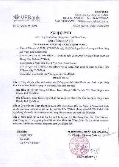 Ngân hàng VPBank sẽ hoạt động PGD VPBank Yên Khánh từ ngày 3/4/2024