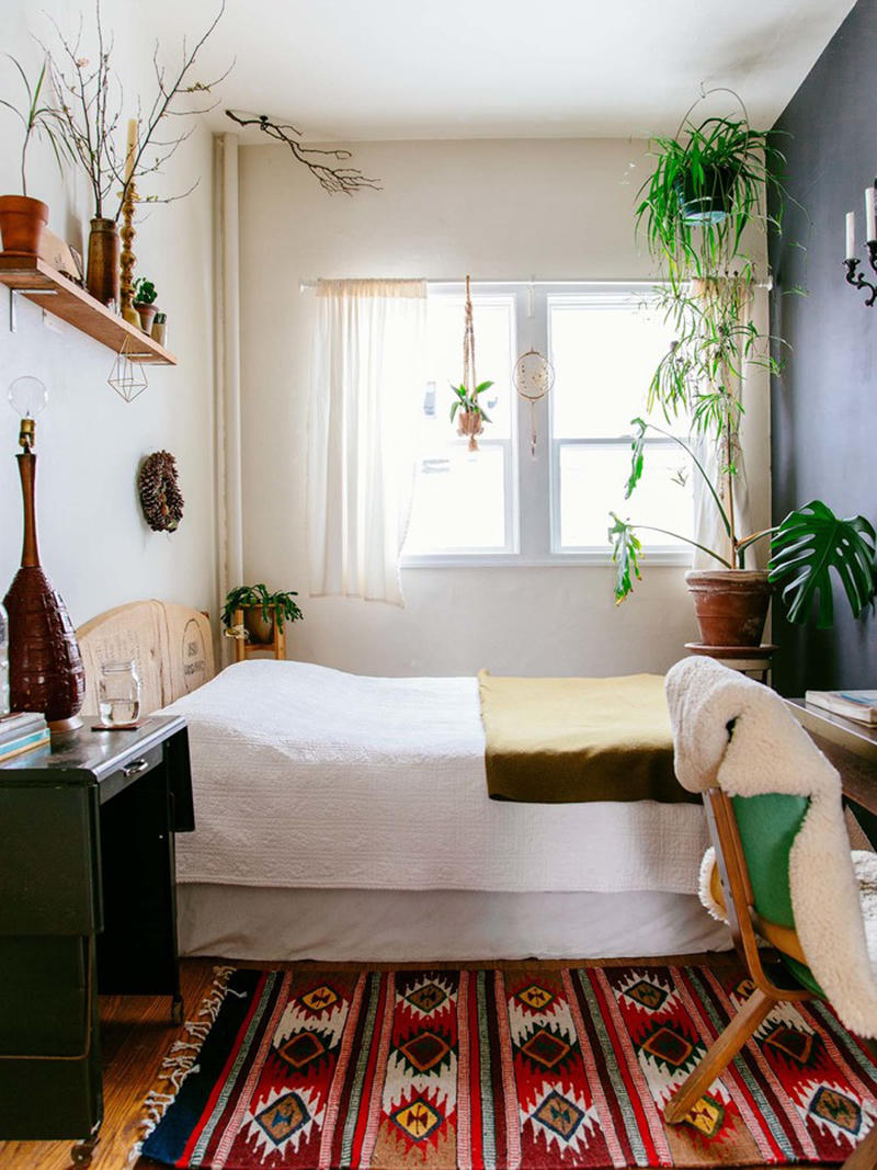 Phòng ngủ này diện tích rất nhỏ nhưng không hề tạo cảm giác bí bách, ngột ngạt bởi chủ nhân đã khéo léo trang trí bằng cây xanh, tận dụng được nguồn ánh sáng cửa sổ. Tấm thảm trải sàn với màu sắc, họa tiết độc đáo khiến phòng ngủ có thêm điểm nhấn.