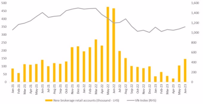 Xét về tốc độ tăng trưởng mở mới theo tháng, số tài khoản mở mới có sự cải thiện rõ rệt so với các tháng trước đó và mức mở mới này được đánh giá là khá kinh ngạc khi cao hơn nhiều tháng trong năm 2021, thời kỳ VN-Index tăng trưởng ấn tượng.
