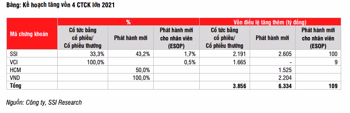 Về kế hoạch tăng vốn, theo SSI Research nhận định, dư địa phát triển mảng cho vay doanh nghiệp với tài sản đảm bảo là cổ phiếu còn lớn. Do đó, các công ty chứng khoán lớn đều lên kế hoạch tăng vốn tổng cộng 6.443 tỷ đồng từ phát hành mới trong năm 2021.