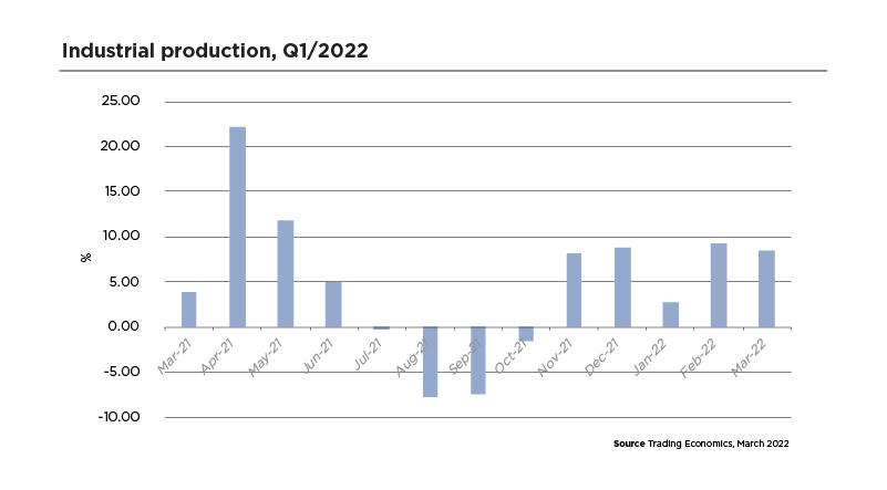 Nền kinh tế Việt Nam được dự báo sẽ phát triển ngoài mong đợi vào năm 2022 khi nhu cầu trong nước phục hồi và dòng FDI vẫn tăng trưởng ổn định. Theo Tổng cục Thống kê (GSO), GDP tăng 5,0% so với cùng kỳ năm trước (YoY) trong Q1.2022. Mặc dù cao hơn mức tăng trưởng 4,7% của Q1.2021 và mức tăng trưởng 3,7% của Q1.2020 song vẫn thấp hơn mức 6,85% được ghi nhận trong năm 2019.
