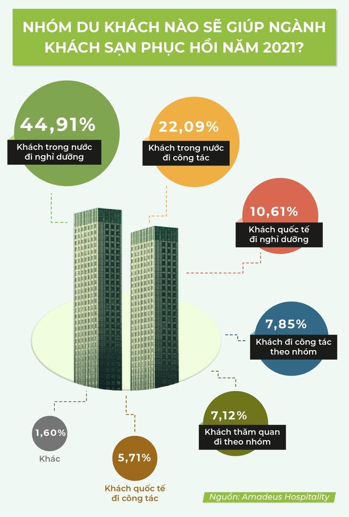 Theo khảo sát tỉ lệ của các nhóm khách có tiềm năng giúp ngành khách sạn phục hồi trong năm 2021 chia làm 6 nhóm. Chiếm tỉ lệ cao nhất 44,91% là nhóm khách trong nước đi nghỉ dưỡng, tiếp theo là nhóm khách trong nước đi công tác chiếm 22,09%. Như vậy, khách nội địa bao gồm cả khách đi nghỉ dưỡng và khách đi công tác sẽ vẫn là động lực chính cho ngành du lịch trong thời gian tới.