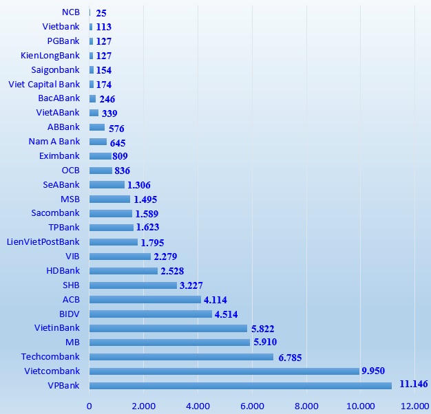 Những ngân hàng có lợi nhuận trước thuế xếp ở những vị trí tiếp theo là Techcombank (6.785 tỷ đồng), MB (5.910 tỷ đồng), VietinBank (5.822 tỷ đồng), BIDV (4.514 tỷ đồng), ACB (4.114 tỷ đồng), SHB (3.227 tỷ đồng)…