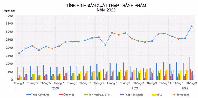 Theo đó, trong tháng 3/2022, sản xuất thép thành phẩm đạt 3,338 triệu tấn, tăng 29,16% so với tháng 2/2022 và tăng 6,8% so với cùng kỳ 2021. Tiêu thụ thép các loại đạt 3,123 triệu tấn, tăng 21,3% so với tháng trước và tăng 2,4% so với cùng kỳ.