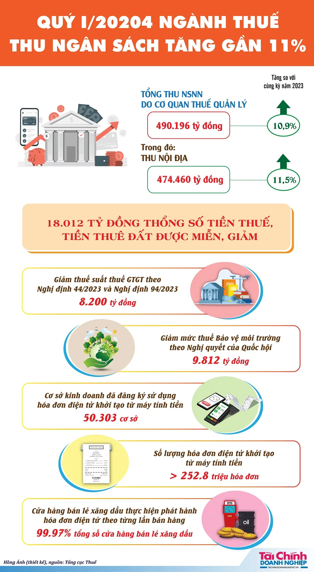 Theo Tổng cục Thuế, trong quý 1/2024, tổng thu ngân sách Nhà nước do cơ quan thuế quản lý ước đạt 490.196 tỷ đồng, bằng 33% so với dự toán năm 2024, tăng 10,9% so với cùng kỳ năm 2023.