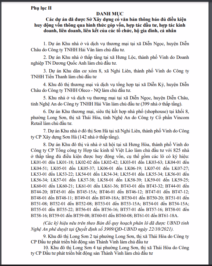 Ngoài ra, Sở Xây dựng cũng thông báo 10 dự án đủ điều kiện huy động vốn thông qua hình thức góp vốn, hợp tác đầu tư, hợp tác kinh doanh, liên doanh, liên kết của các tổ chức, hộ gia đình, cá nhân như: Khu nhà ở và dịch vụ thương mại tại xã Diễn Ngọc, huyện Diễn Châu do Công ty TNHH Hải Vân làm chủ đầu tư; Khu đô thị thương mại và dịch vụ tổng hợp tại xã Diễn Kỷ, huyện Diễn Châu của Công ty TNHH Oleco - NQ; 399 nhà ở thấp tầng trong Khu nhà ở và dịch vụ thương mại tại xã Diễn Ngọc, huyện Diễn Châu do Công ty TNHH Hải Vân làm chủ đầu tư;