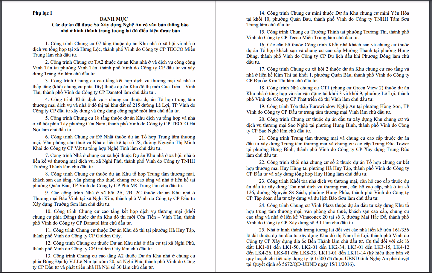 Chung cư thuộc Dự án Khu đô thị tại phường Hà Huy Tập, thành phố Vinh do Công ty CP Golden City; chung cư thuộc Dự án Khu nhà ở dân cư tại xã Nghi Phú, thành phố Vinh do Công ty CP Golden City làm chủ đầu tư; chung cư cao tầng A2 thuộc Dự án khu nhà ở chung cư phía Đông Đại lộ V.I.Lê Nin tại xóm 20, xã Nghi Phú, thành phố Vinh do Công ty CP Đầu tư và phát triển nhà Hà Nội số 30 làm chủ đầu tư; Chung cư Trường Thịnh tại phường Trường Thi, thành phố Vinh do Công ty CP Tecco Miền Trung làm chủ đầu tư; Các căn hộ thuộc công trình khối nhà khách sạn và chung cư thuộc dự án Tổ hợp khách sạn và chung cư cao cấp Mường Thanh tại phường Hưng Dũng, thành phố Vinh do Công ty CP Du lịch dầu khí Phương Đông làm chủ đầu tư;