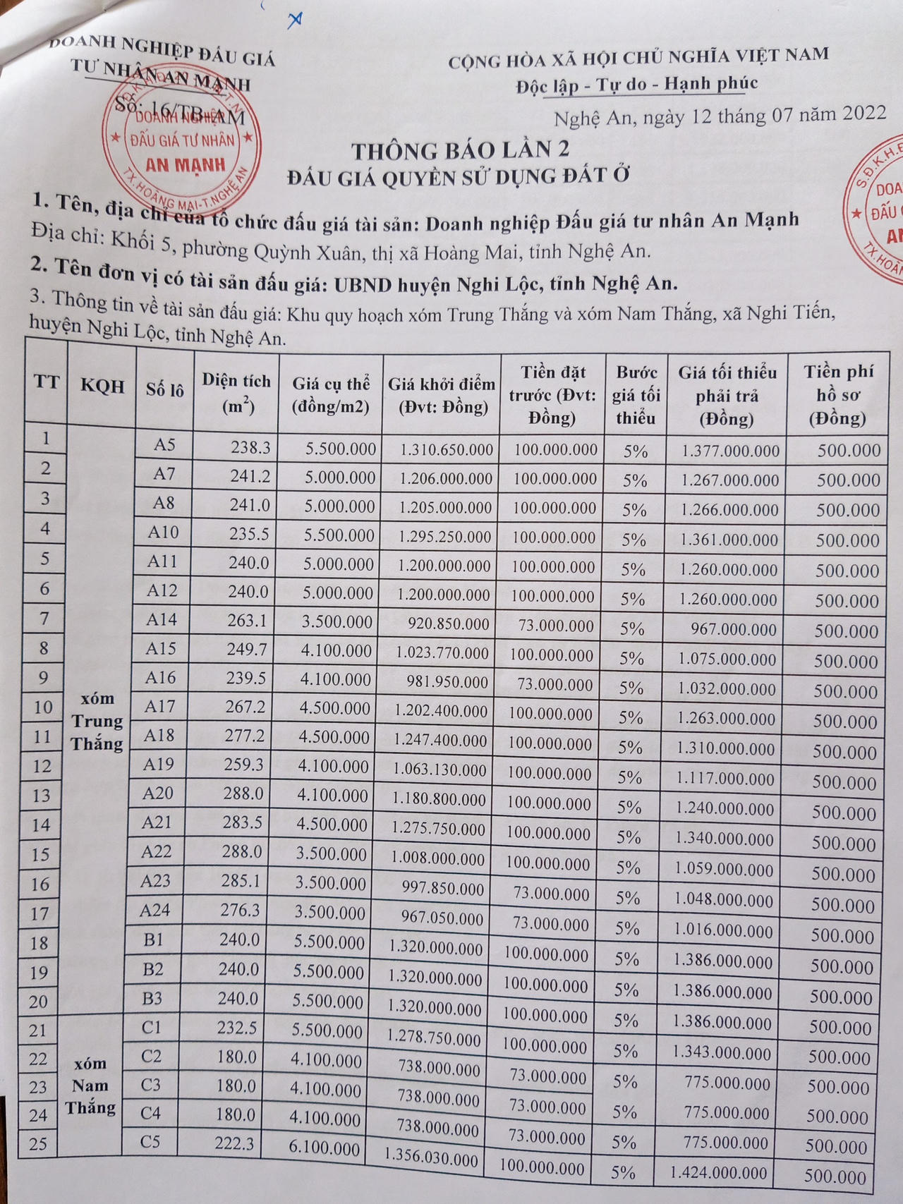 Thời gian, địa điểm bán hồ sơ đấu giá từ ngày 12/7 đến 17h ngày 26/7/2022 tại phòng Tư Pháp huyện Nghi Lộc, UBND xã Nghi Tiến và Doanh nghiệp Đấu giá tư nhân An Mạnh (khối 5, phường Quỳnh Xuân, TX Hoàng Mai). Hồ sơ đấu giá do An Mạnh phát hành riêng cho xã Nghi Tiến. Công ty không thu nhận những hồ sơ không phải do công ty phát hành theo quy định này.