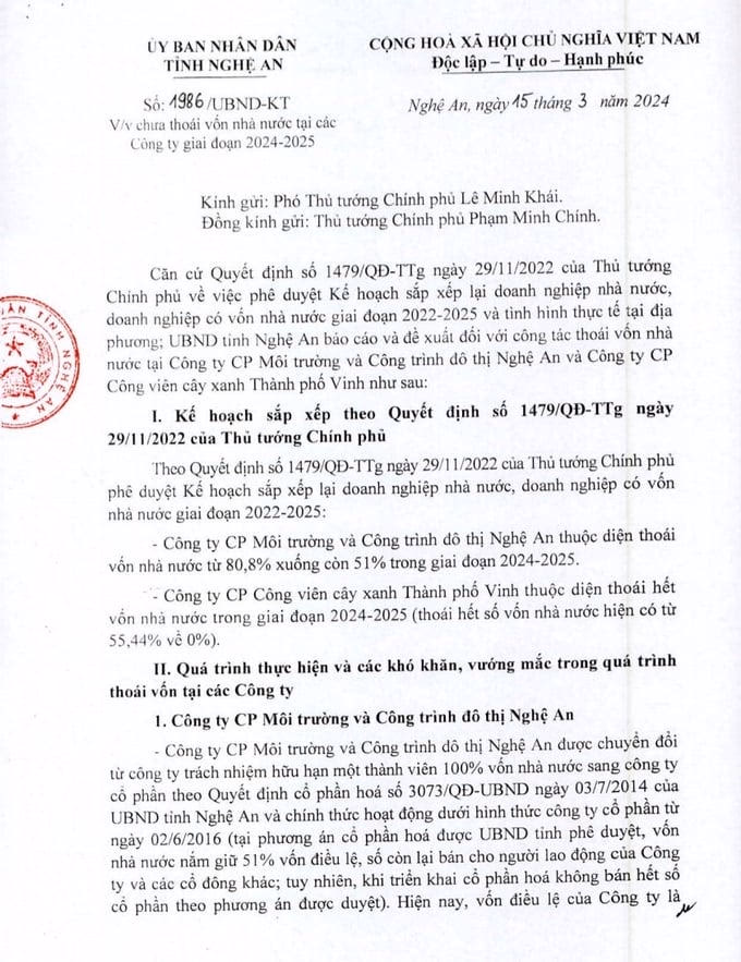 Hiện, căn cứ các quy định và tình hình thực tế tại địa phương, UBND tỉnh Nghệ An trình Phó Thủ tướng Lê Minh Khái xem xét, báo cáo Thủ tướng Chính phủ cho phép tỉnh Nghệ An chưa thực hiện thoái vốn nhà nước tại CTCP Môi trường và Công trình đô thị Nghệ An và CTCP Công viên cây xanh thành phố Vinh trong giai đoạn 2024-2025.