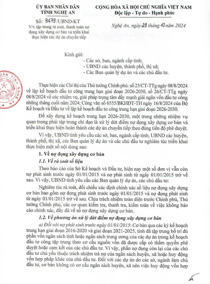 Trước thực trạng trên, ngày 29/10, UBND tỉnh Nghệ An đã ban hành Công văn số 9479/UBND-KT về việc tập trung rà soát, thanh toán nợ đọng xây dựng cơ bản và triển khai thực hiện các dự án chuyển tiếp.