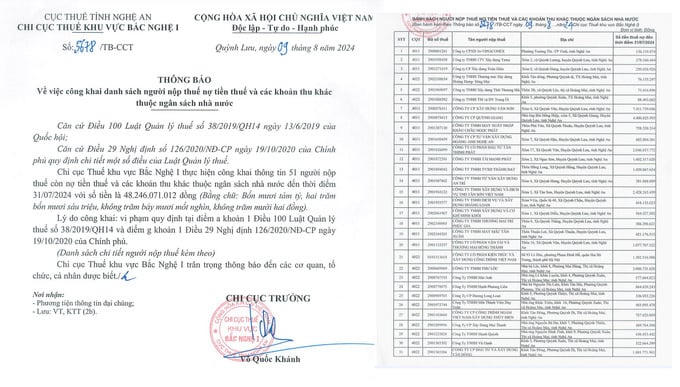 Cùng với đó, Chi Cục Thuế khu vực Sông Lam II (Cục Thuế Nghệ An) cũng vừa có Thông báo số 2734/TB-CCT thực hiện công khai thông tin 89 đơn vị còn nợ tiền thuế và các khoản thu khác thuộc ngân sách nhà nước đến thời điểm ngày 31/7/2024, với số tiền là hơn 16,4 tỷ đồng.