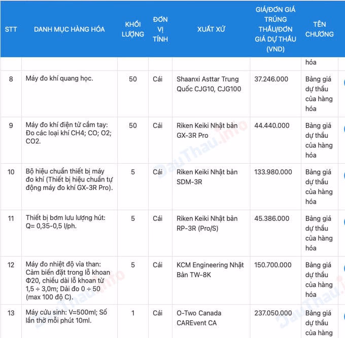 Máy đo nhiệt độ vỉa than: Cảm biến đặt trong lỗ khoan Φ20, chiều dài lỗ khoan từ 1,5 ÷ 3,0m; Dải đo 0 ÷ 50 (max 100 độ C). KCM Engineering Nhật Bản TW-8K có giá trúng thầu là 150.700.000 đồng, giá thị trường khoảng 132.000.000 đồng, chênh lệch 18.700.000 đồng/cái.