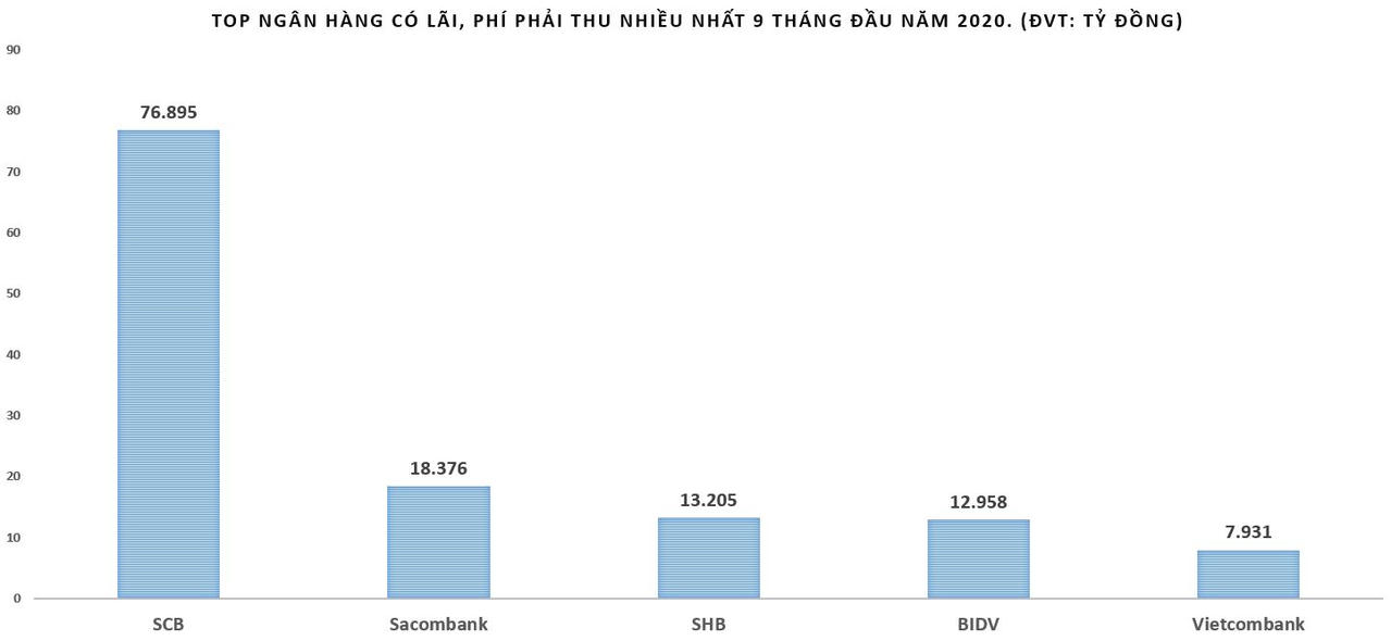 Đáng chú ý, khoản lãi và phí phải thu (lãi dự thu) tại SCB trong 9 tháng đầu năm 2020 lên tới 76.895 tỷ đồng, tương đương tăng tới 45% so với đầu năm, cao nhất hệ thống ngân hàng.