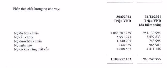 Về chất lượng tín dụng, tổng nợ xấu tính đến ngày 30/06/2022 của Vietcombank tăng 9% so với đầu năm, ghi nhận gần 6.694 tỷ đồng. Trong đó, nợ dưới tiêu chuẩn tăng mạnh nhất đến 80%, chiếm 1.340 tỷ đồng; nợ có khả năng mất vốn tăng nhẹ 6% lên hơn 4.699 tỷ đồng và nợ nghi ngờ giảm 31% xuống còn 664 tỷ đồng. Do đó, tỷ lệ nợ xấu trên dư nợ vay giảm nhẹ từ mức 0,64% đầu năm xuống còn 0,61%.