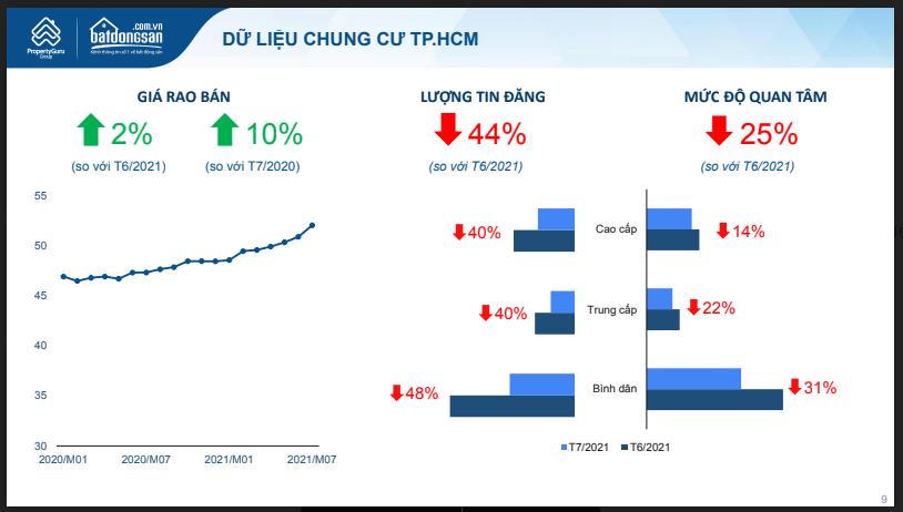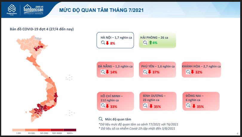 Tại TP HCM, thị trường này ghi nhận mức sụt giảm mạnh do có số ca nhiễm Covid - 19 lớn nhất cả nước. Lượng tin đăng bán giảm 52%, mức độ quan tâm giảm 33% so với tháng trước, ở hầu hết các loại hình, phân khúc bất động sản.