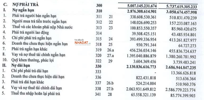 Tính đến ngày 30/9/2021, nợ phải trả ở mức 3,783 tỷ đồng, giảm 5%. Trong đó, nợ vay ngắn hạn hơn 743 tỷ đồng (tăng 39%), nợ vay dài hạn gần 1,225 tỷ đồng (giảm 13%), người mua trả tiền trước ngắn hạn hơn 278 tỷ đồng (tăng 9%).