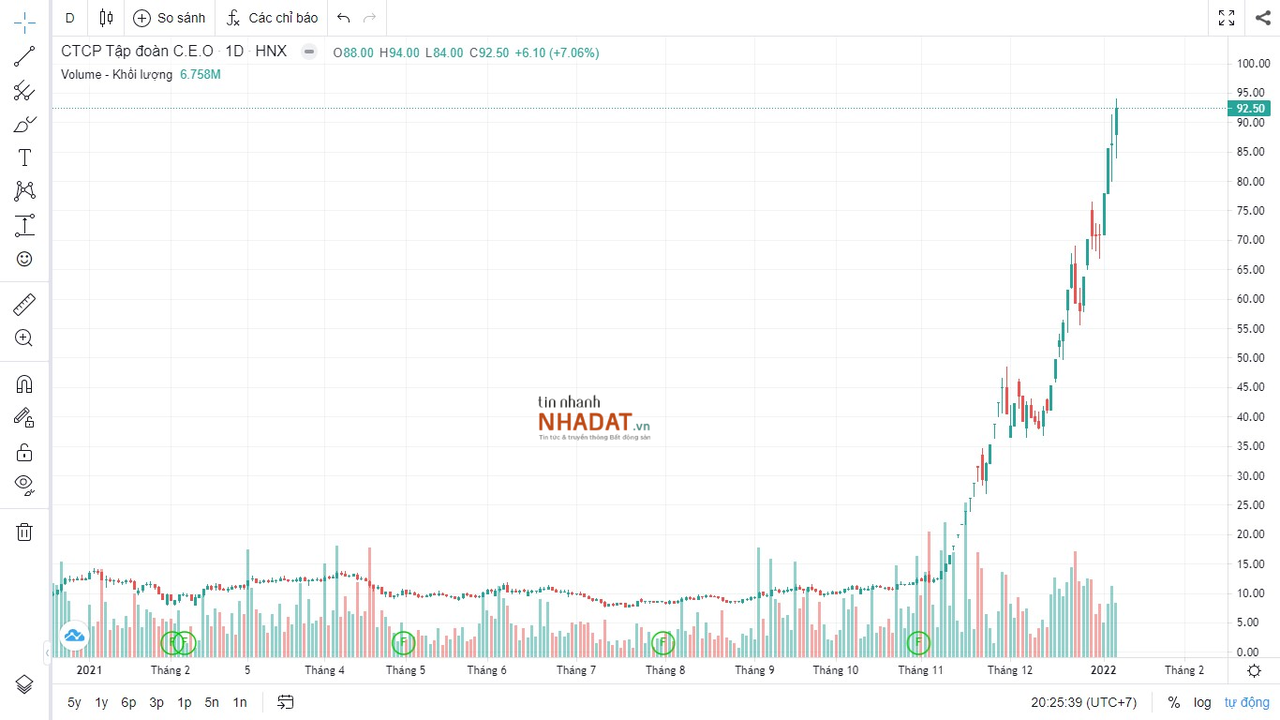 Kết phiên ngày cuối cùng của năm 2021, thị giá cổ phiếu CEO ở mức 70.900 đồng/ cổ phiếu (tăng khoảng 467% so với thời điểm đầu năm 2021). Nếu chỉ tính riêng trong tháng 12/2021, cổ phiếu CEO đã tăng hơn 96% (từ vùng giá 36.500 đồng/cổ phiếu lên đến 70.000 đồng/cổ phiếu).