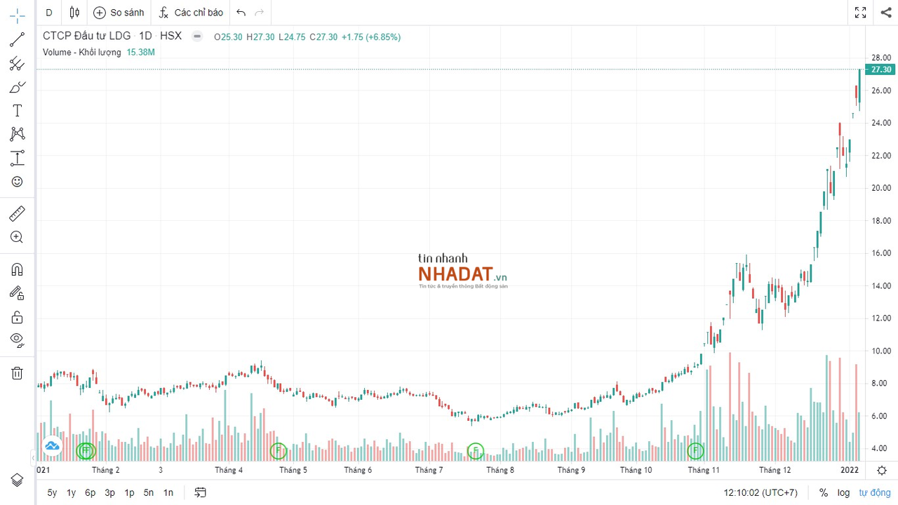 Kết phiên ngày 7/1/2022 cổ phiếu LDG tăng kịch trần lên mức giá 27.300 đồng/cổ phiếu. Cùng thời điểm năm ngoái, cổ phiếu này vẫn chỉ đang loanh quanh ở mức giá 7.100 đồng/cổ phiếu. Một biên độ tăng giá cực kỳ nóng chỉ trong vòng chưa đầy 1 năm.