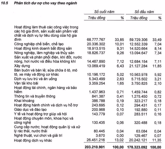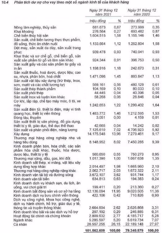 Còn tổng cho vay khách hàng năm 2021 của MSB đạt hơn 101,5 nghìn tỷ đồng, trong đó chovay cá nhân chỉ hơn 26,5 nghìn tỷ đồng. Phần lớn khoán cho vay đổ vào nhóm ngành xây dựng (gần 14.200 tỷ đồng), nhóm ngành kinh doanh bất động sản (hơn 12.100 tỷ đồng, nhóm ngành hoạt động tài chính chứng khoán hơn 2.800 tỷ đồng. MSB còn cho vay nhóm sản xuất vật liệu xây dựng, thép, phôi thép, inox và luyện kim gần 800 tỷ đồng.