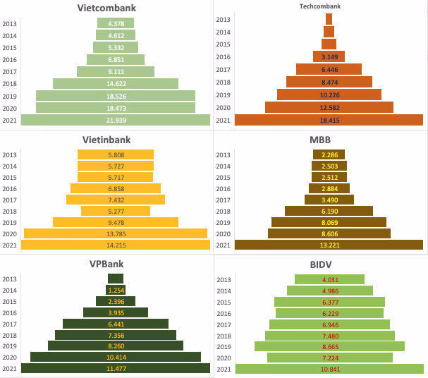 TOP 6 ngân hàng lãi lớn nhất, với số lãi sau thuế tính bằng chục nghìn tỷ thì có Vietcombank, có Techcombank, có Vietinbank, có MBBank, có VPBank và BIDV. Trong đó Vietcombank báo lãi lớn nhất hơn 21.900 tỷ đồng, tăng 18,9% so với năm 2020 và tăng khoảng 3.400 tỷ đồng lợi nhuận sau thuế so với năm 2019 – năm trước Covid.