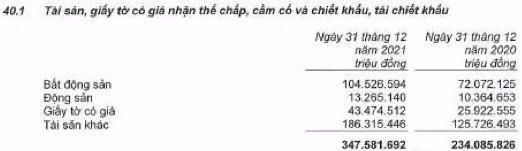 MSB cũng ghi nhận năm 2021 vừa qua ngân hàng nhận thế chấp với giá trị tài sản đảm bảo gần 347.600 tỷ đồng, trong đó riêng giá trị bất động sản và động sản thế chấp tăng gần gấp rưỡi lên gần 117.800 tỷ đồng. Các giấy tờ có giá đạt gần 43.500 tỷ đồng.