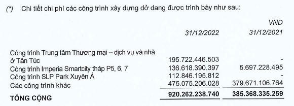 | Hàng tồn kho của Ricons, chủ yếu là chi phí xây dựng các công trình dở dang, tăng 139% so với đầu năm |