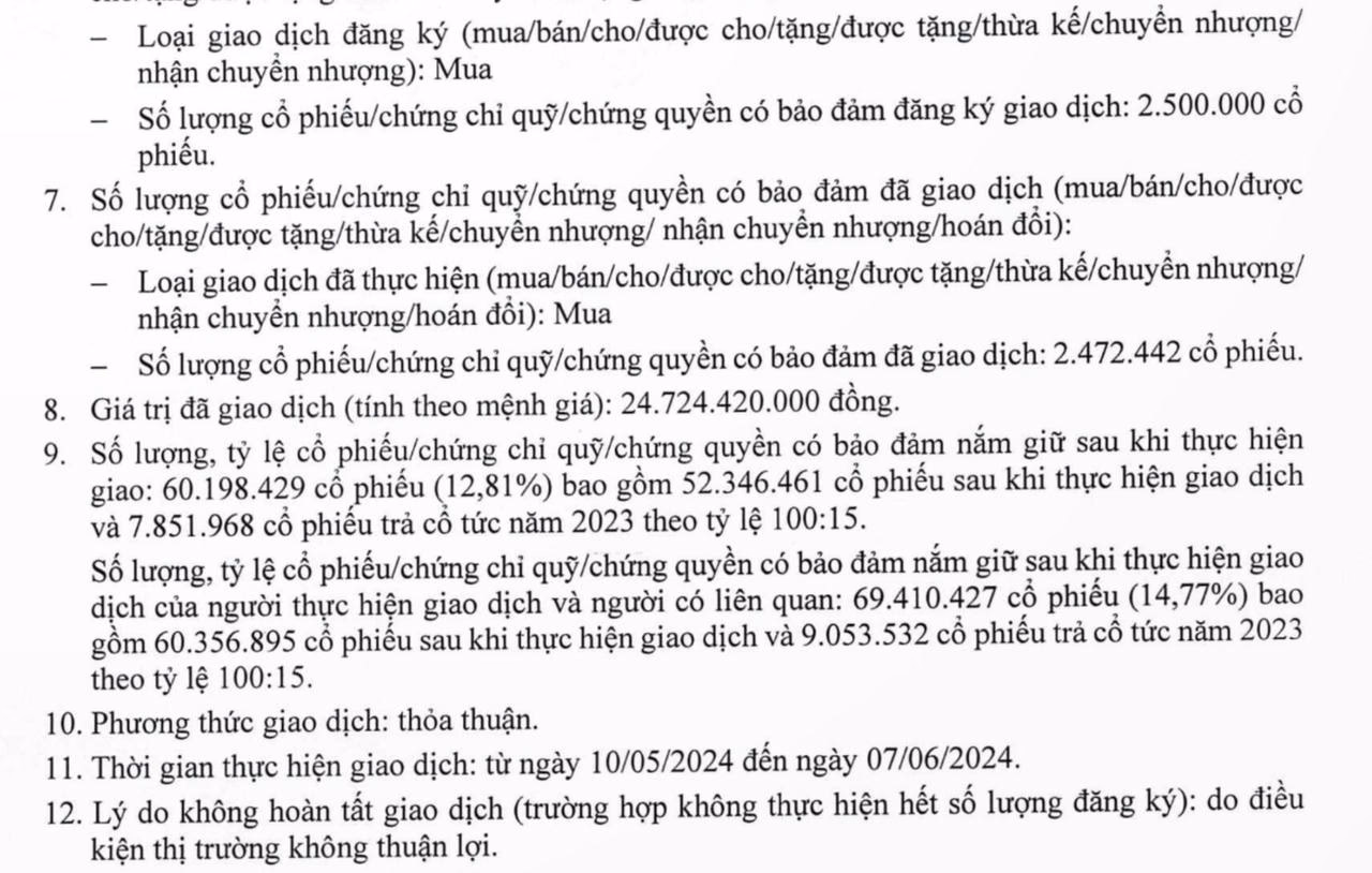 Đáng chú ý, theo báo cáo, sau giao dịch tỷ lệ sở hữu của bà Nguyễn Thị Mai Thanh đã được nâng lên mức 12,81%, tương đương số lượng cổ phiếu nắm giữ 60,2 triệu đơn vị. Nguyên nhân là nữ Chủ tịch đã nhận thêm gần 7,85 triệu cổ phiếu trả cổ tức năm 2023, bên cạnh 52,34 triệu cổ phiếu có được sau giao dịch nói trên.