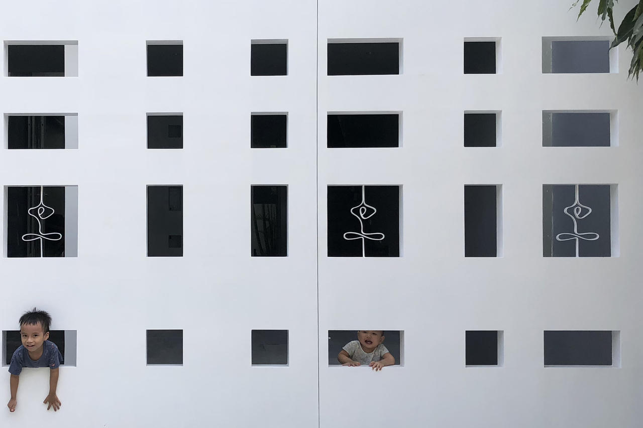 Những đứa trẻ đùa nghịch qua những ô cửa sổ.