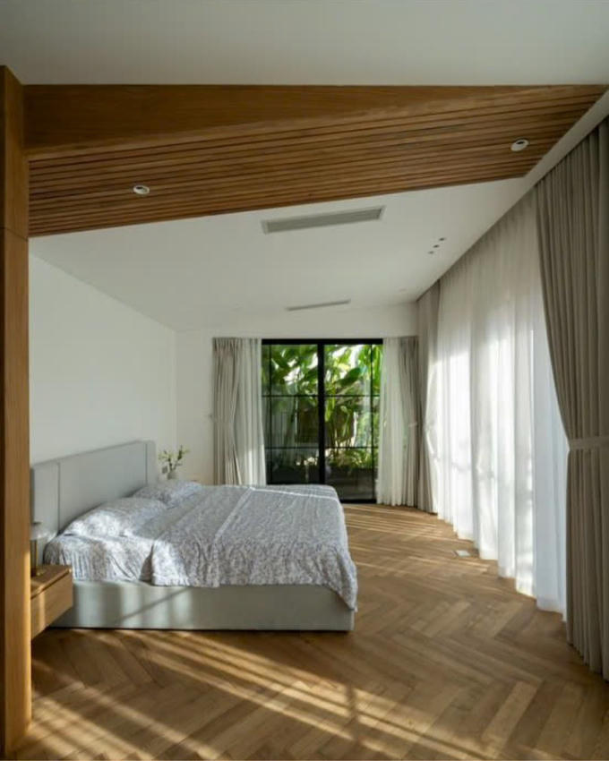 Phòng ngủ được thiết kế đơn giản, chan hòa với ánh sáng và không khí trong lành, tạo ra không gian thư giãn lý tưởng.