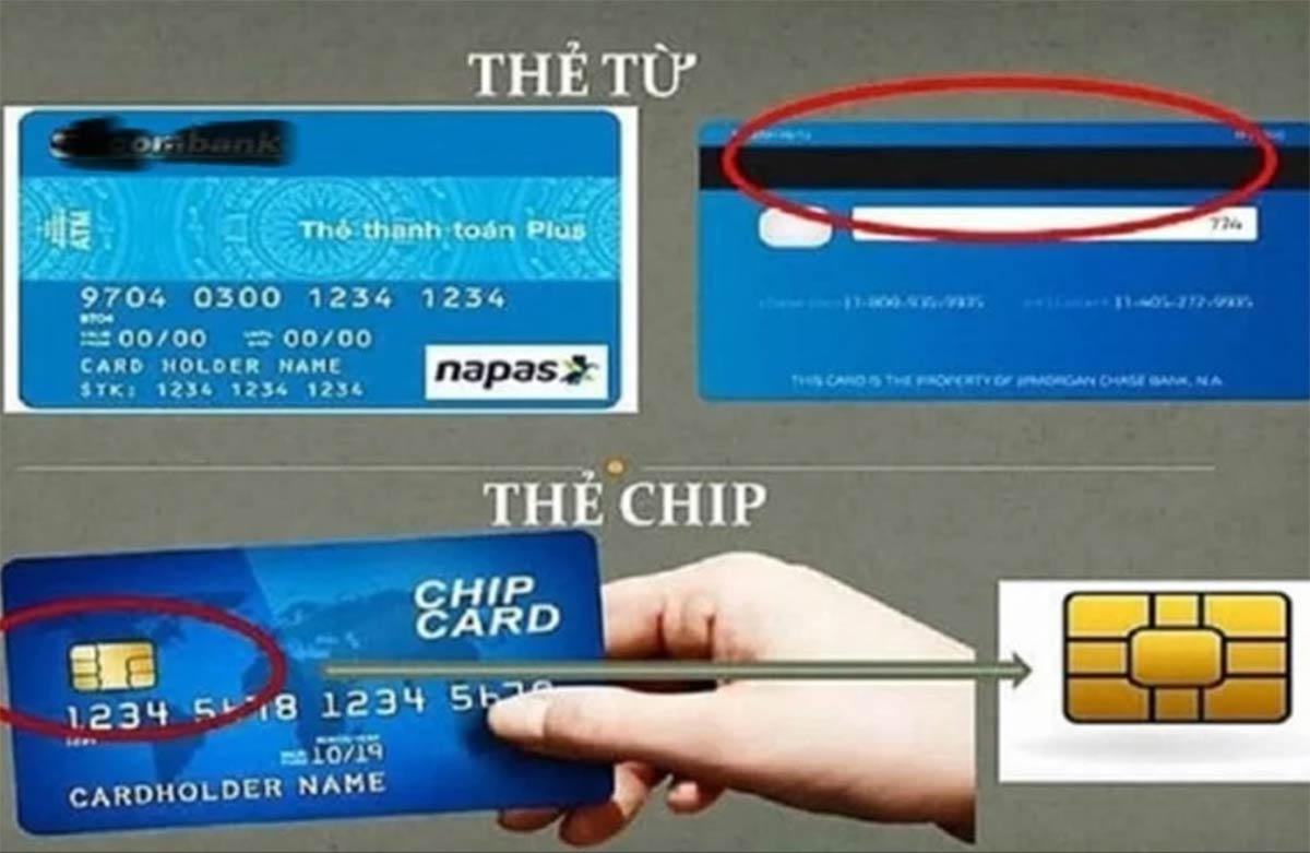 Nếu mặt trước thẻ không có ô chip màu vàng (vi mạch điện tử) mà chỉ có dải từ đen phía sau thì đó là thẻ từ và bắt buộc phải đổi. Thông tin chủ thẻ sẽ được lưu trên dải từ và có rủi ro bị kẻ xấu sao chép tiến hành làm một chiếc thẻ giả và thực hiện hành vi đánh cắp tiền. Những chiếc thẻ này cần sớm được chuyển đổi.
