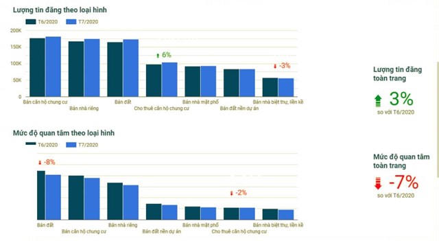 Theo báo cáo tiêu điểm thị trường bất động sản tháng 7 của Batdongsan.com.vn, làn sóng Covid-19 thứ hai bùng phát trở lại ở Việt Nam từ ngày 25/7 và ngay lập tức tác động tới thị trường. Lượng tin đăng và mức độ quan tâm giảm trong các ngày cuối tháng. Tính chung cả tháng, mức độ quan tâm giảm 7% so với tháng trước, người tìm kiếm ít quan tâm tới đất thổ cư hơn.