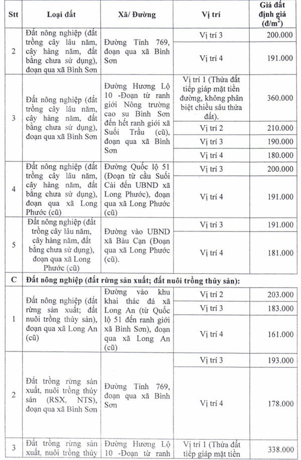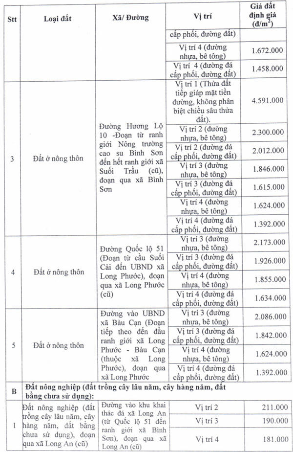 Đất ở nông thôn đường vào khu khai thác đá xã Long An đoạn từ Quốc lộ 51 đến ranh giới xã Bình Sơn, giá đất bồi thường dao động từ 1.625.000 đồng/m2 - 6.573.000 đồng/m2.