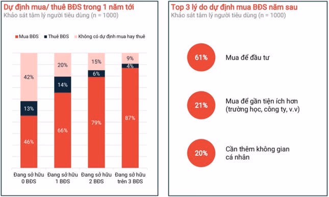 Cũng theo dữ liệu khảo sát tâm lý người mua BĐS của Batdongsan.com.vn thì có tới 87% người đã sở hữu 3 BĐS trở lên có nhu cầu tiếp tục mua nhà, đất trong năm tới. Trong khi đó, người đã sở hữu 1-2 BĐS thì có nhu cầu tiếp tục mua nhà, đất chiếm lần lượt 66 -79%. Còn nhóm người chưa có nhà, đất thì có nhu cầu mua BĐS chỉ chiếm 46%, có lẽ do phải ưu tiên các nhu cầu cấp bách hàng ngày khác hơn các nhóm khác.